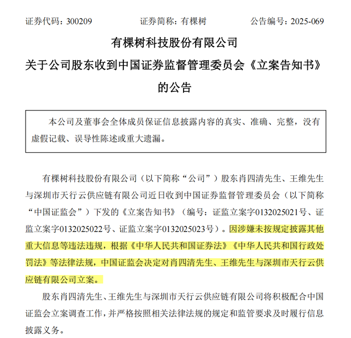 据有棵树公告,9月29日,股东肖四清、王维与天行云收到中国证监会下发的《立案告知书》,因涉嫌未按规定披露其他重大信息等违法违规,根据《中华人民共和国证券法》《中华人民共和国行政处罚法》等法律法规,中国证监会决定对肖四清、王维与天行云立案。