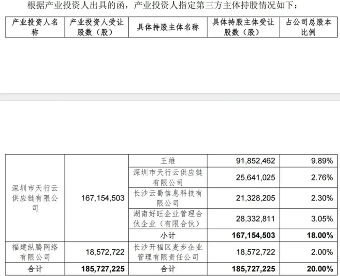 今年3月,法院通过司法扣划方式将有棵树产业投资人受让的转增股份全部过户至产业投资人指定持股主体名下,王维由此直接持股有棵树9.89%股份,成为公司第一大股东。同时,王维及其一致行动人深圳市天行云供应链有限公司(下称“天行云”)、长沙云蜀、湖南好旺合计持股有棵树18.00%股份。