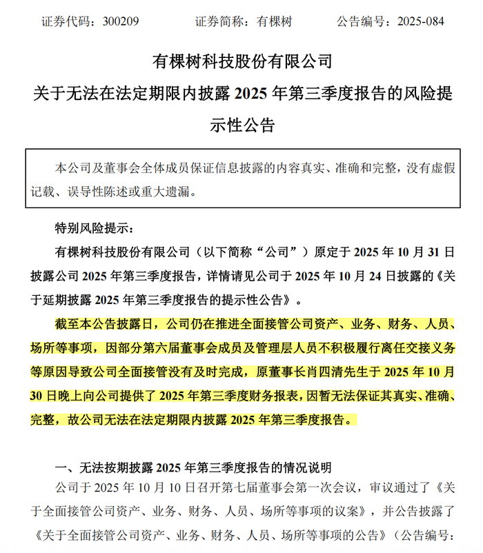 10月31日,有棵树发布风险提示性公告显示,公司原定于10月31日披露2025年第三季度报告,截至公告披露日,公司仍在推进全面接管公司资产、业务、财务、人员、场所等事项,因部分第六届董事会成员及管理层人员不积极履行离任交接义务等原因导致公司全面接管没有及时完成,原董事长肖四清于10月30日晚上向公司提供了2025年第三季度财务报表,因暂无法保证其真实、准确、完整,故公司无法在法定期限内披露2025年第三季度报告。