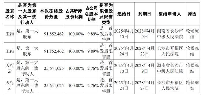 10月31日的补充公告显示,王维所持有棵树9.89%股份分别于今年4月10日、4月24日遭到湖南省长沙市中级人民法院、长沙市开福区人民法院轮候冻结,到期日皆为2028年。