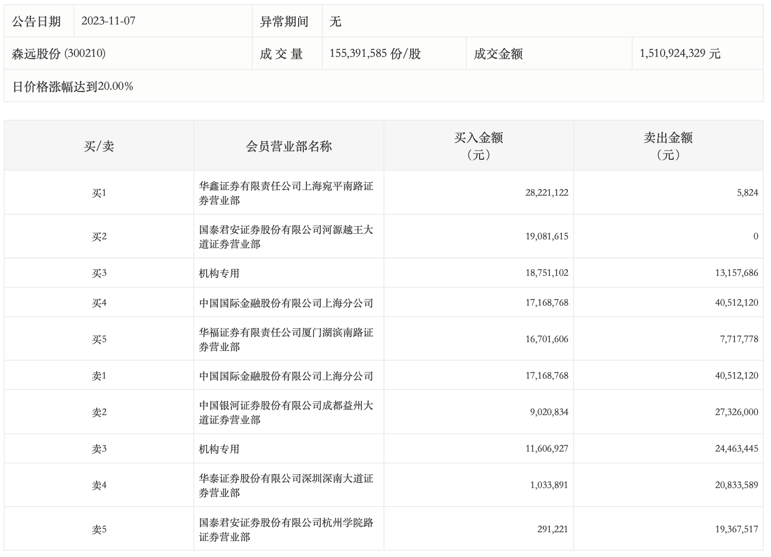 11月7日,森远股份今日涨停,龙虎榜数据显示,上榜营业部席位全天成交2.75亿元,占当日总成交金额比例为18.22%。其中,买入金额为1.22亿元,卖出金额为1.53亿元,合计净卖出3150.69万元。