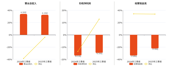 公司营业总收入为4.15亿元。归母净利润为-5.35亿元,较去年同报告期归母净利润增加7831.33万元。经营活动现金净流入为-2.16亿元,较去年同报告期经营活动现金净流入增加1.10亿元,实现2年连续上涨。