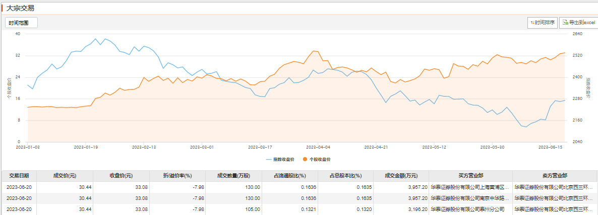 6月20日大宗交易成交365万股,成交额1.11亿元,占当日总成交额的3.05%,成交价30.44元,较市场收盘价33.08元折价7.98%。