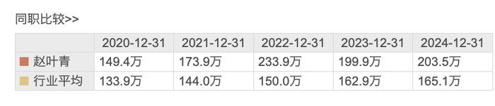 东方财富数据显示,2020年至2024年,赵叶青薪酬分别为149.4万元、173.9万元、233.9万元、199.9万元、203.5万元。