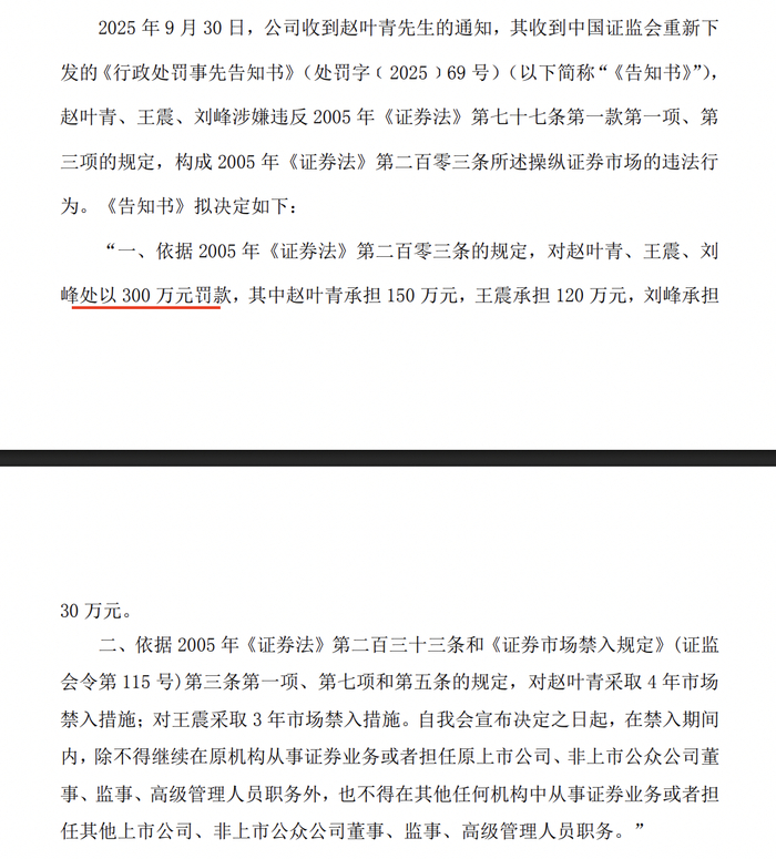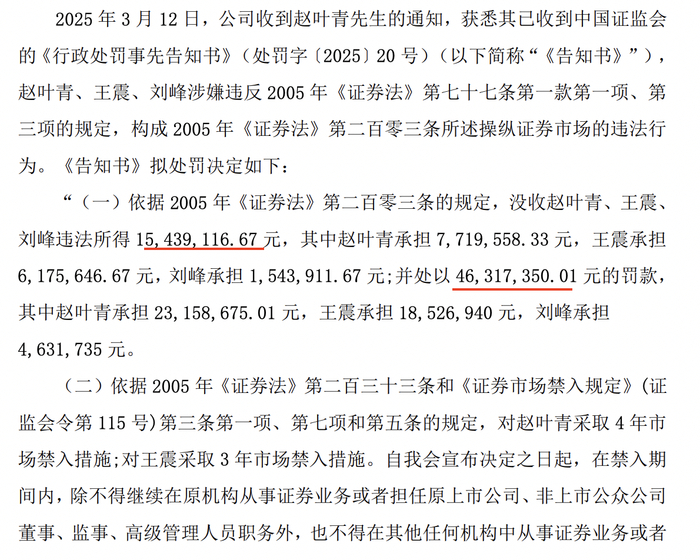 因涉嫌操纵证券市场违法违规行为,中国证监会对赵叶青、王震、刘峰处以300万元罚款,其中赵叶青承担150万元,王震承担120万元,刘峰承担30万元。中国证监会对赵叶青采取4年市场禁入措施;对王震采取3年市场禁入措施。