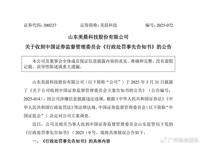 2025年9月27日,山东美晨科技股份有限公司(公司或美晨科技)披露,收到山东监管局下发的《行政处罚事先告知书》。