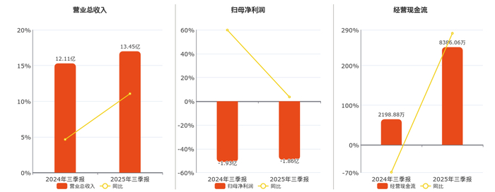 公司营业总收入为13.45亿元,较去年同报告期营业总收入增加1.34亿元,实现3年连续上涨,同比较去年同期上涨11.06%。归母净利润为-1.86亿元,较去年同报告期归母净利润增加2.13亿元,实现2年连续上涨。经营活动现金净流入为8386.06万元,较去年同报告期经营活动现金净流入增加6187.18万元,同比较去年同期上涨281.38%。