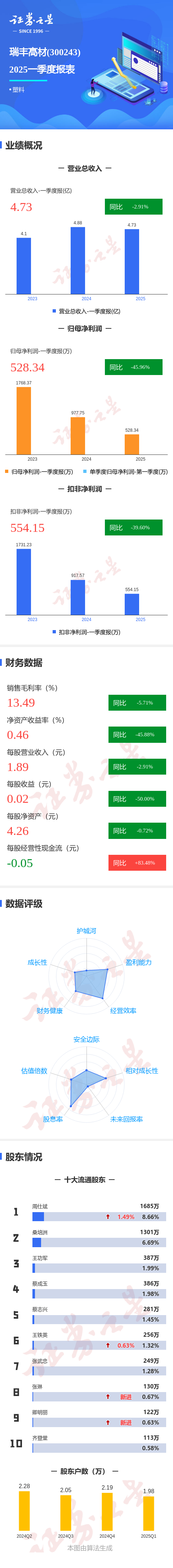 图解瑞丰高材一季报:第一季度单季净利润同比减45.96%