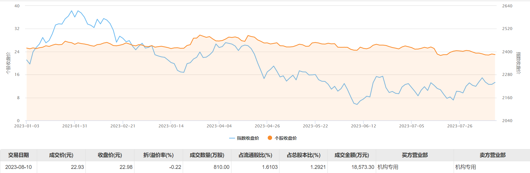 8月10日大宗交易成交810万股,成交额1.86亿元,占当日总成交额的80.63%,成交价22.93元,较市场收盘价22.98元折价0.22%。