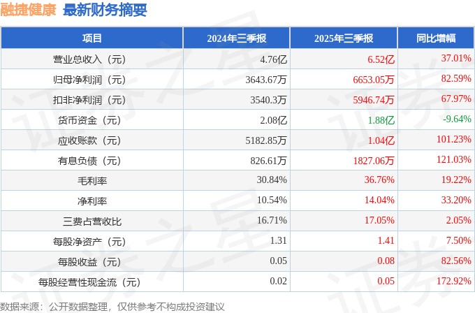 据证券之星公开数据整理,近期融捷健康(300247)发布2025年三季报。截至本报告期末,公司营业总收入6.52亿元,同比上升37.01%,归母净利润6653.05万元,同比上升82.59%。按单季度数据看,第三季度营业总收入2.19亿元,同比上升53.87%,第三季度归母净利润1900.67万元,同比上升144.92%。本报告期融捷健康应收账款上升,应收账款同比增幅达101.23%。