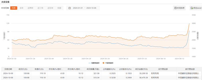 今日大宗交易成交836.94万股,成交额9.18亿元,占当日总成交额的8.24%,成交价109.66元,较市场收盘价折价8%。