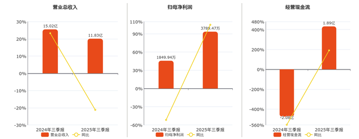 公司营业总收入为11.83亿元,较去年同报告期营业总收入减少3.19亿元,同比较去年同期下降21.22%。归母净利润为3789.47万元。经营活动现金净流入为1.89亿元。