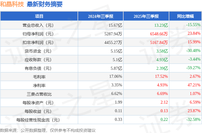 和晶科技(300279)2025年三季报简析:净利润同比增长23.84%,公司应收账款体量较大