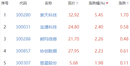 其中,紫天科技、宝通科技、朗玛信息、协创数据和慈星股份位列板块涨幅前五位,涨幅分别为5.45%、2.40%、2.26%、2.23%和1.98%。