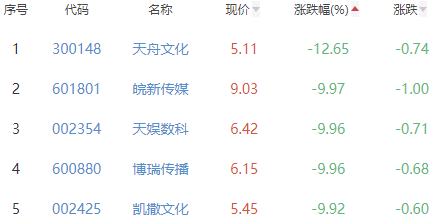 天舟文化、皖新传媒、天娱数科、博瑞传播和凯撒文化位列涨幅榜后五位,涨幅分别为-12.65%、-9.97%、-9.96%、-9.96%和-9.92%。