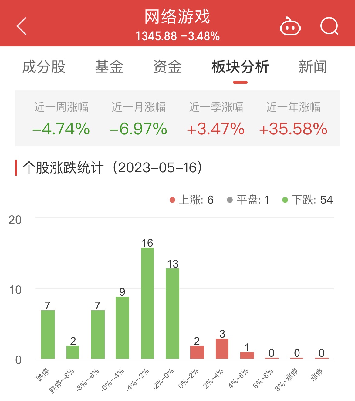 中国经济网北京5月16日讯今日,网络游戏板块整体涨幅-3.48%,其中6只股票上涨,1只股票平盘,54只股票下跌。