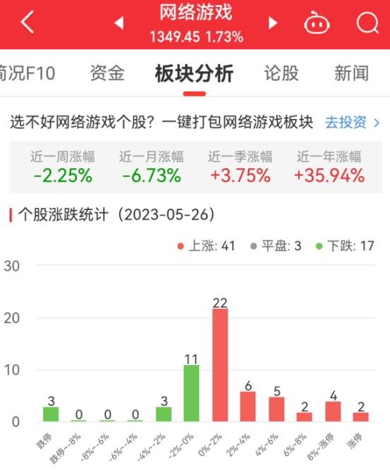 中国经济网北京5月26日讯今日,网络游戏板块整体涨幅1.73%,其中41只股票上涨,3只股票平盘,17只股票下跌。