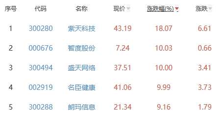 其中,紫天科技、智度股份、盛天网络、名臣健康、朗玛信息位列板块涨幅前五位,涨幅分别为18.07%、10.03%、10.00%、9.99%、9.16%。