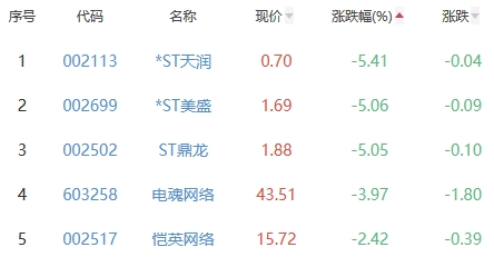 *ST天润、*ST美盛、ST鼎龙、电魂网络、恺英网络位列涨幅榜后五位,涨幅分别为-5.41%、-5.06%、-5.05%、-3.97%、-2.42%。