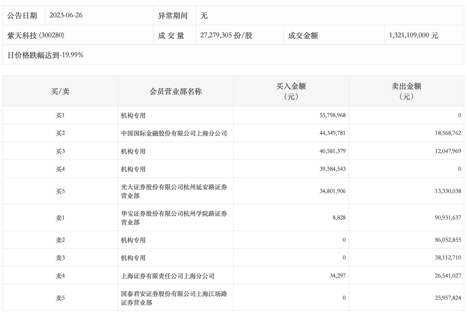 6月26日,紫天科技今日跌19.99%,龙虎榜数据显示,上榜营业部席位全天成交5.27亿元,占当日总成交金额比例为39.85%。其中,买入金额为2.15亿元,卖出金额为3.12亿元,合计净卖出9658.31万元。