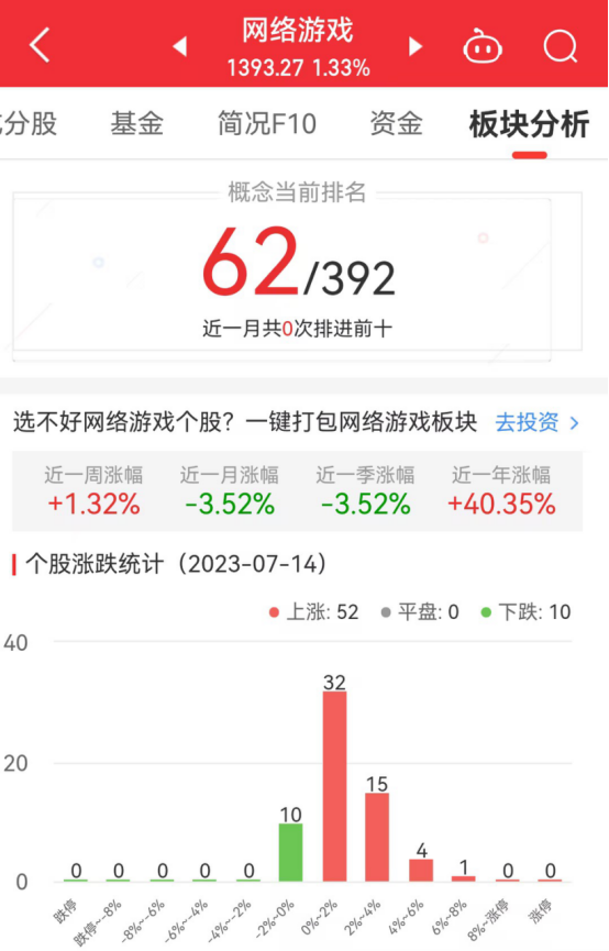 中国经济网北京7月14日讯今日,网络游戏板块整体涨幅1.33%,其中52只股票上涨,10只股票下跌。