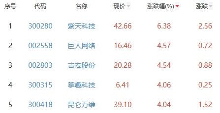 其中,紫天科技、巨人网络、吉宏股份、掌趣科技、昆仑万维位列板块涨幅前五位,涨幅分别为6.38%、4.57%、4.54%、4.06%、4.04%。