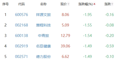 祥源文旅、惠程科技、中青旅、名臣健康、德力股份位列涨幅榜后五位,涨幅分别为-1.95%、-1.55%、-1.54%、-1.49%、-1.49%。