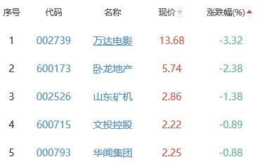 万达电影、卧龙地产、山东矿机、文投控股、华闻集团位列涨幅榜后五位,涨幅分别为-3.32%、-2.38%、-1.38%、-0.89%、-0.88%。