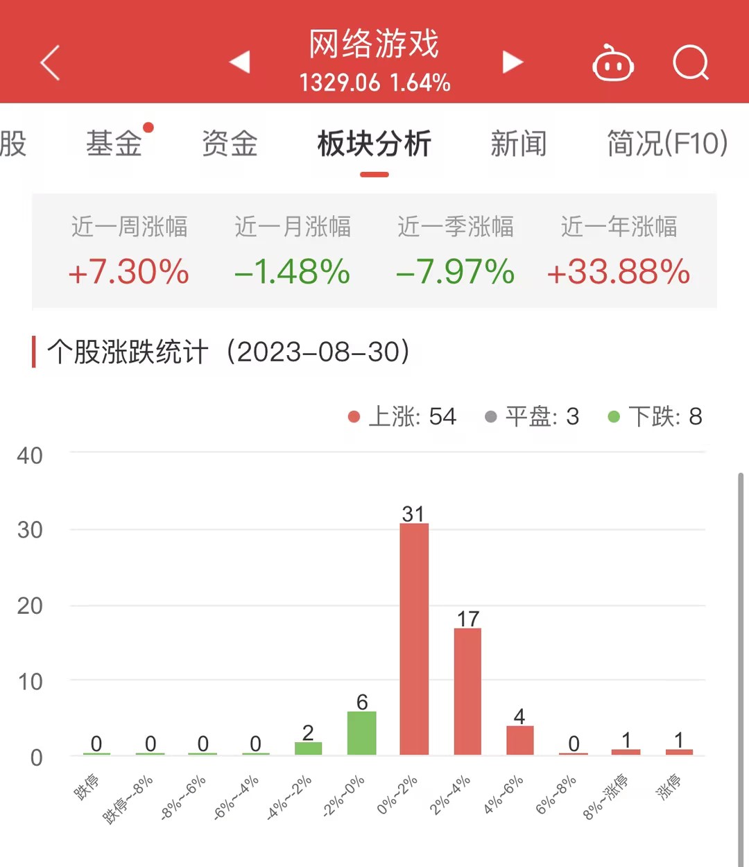 中国经济网北京8月30日讯今日,网络游戏板块整体涨幅1.64%,其中54只股票上涨,3只股票平盘,8只股票下跌。