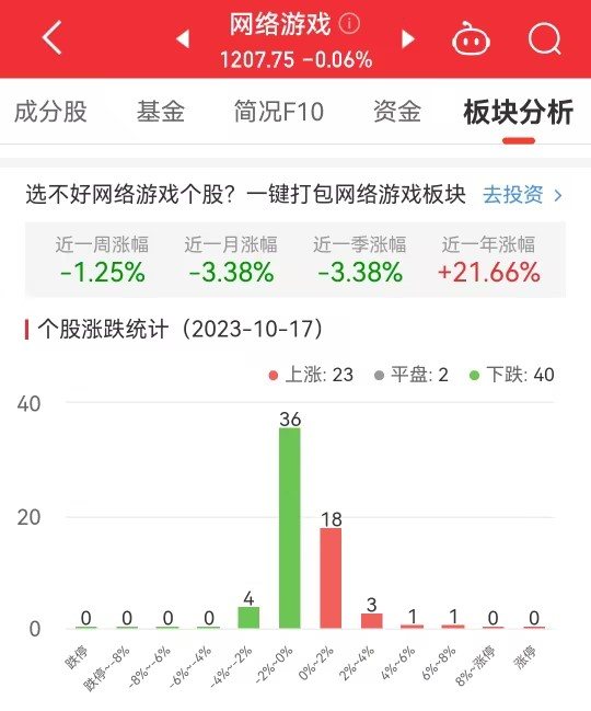 中国经济网北京10月17日讯今日,网络游戏板块整体跌幅0.06%,其中23只股票上涨,2只股票平盘,40只股票下跌。