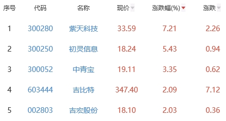 其中,紫天科技(维权)、初灵信息、中青宝、吉比特、吉宏股份位列板块涨幅前五位,涨幅分别为7.21%、5.43%、3.35%、2.09%、2.03%。
