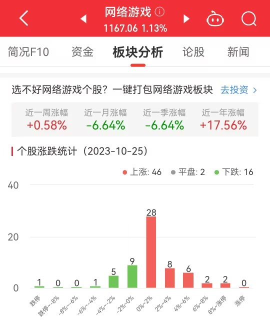 中国经济网北京10月25日讯今日,网络游戏板块整体涨幅1.13%,其中46只股票上涨,2只股票平盘,16只股票下跌。