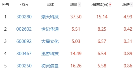 其中,紫天科技、世纪华通、大晟文化、迅游科技、初灵信息位列板块涨幅前五位,涨幅分别为15.14%、8.25%、6.57%、6.54%、5.58%。