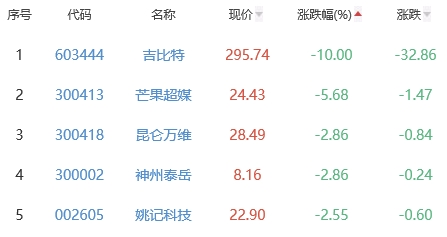 吉比特、芒果超媒、昆仑万维、神州泰岳、姚记科技位列涨幅榜后五位,涨幅分别为-10.00%、-5.68%、-2.86%、-2.86%、-2.55%。