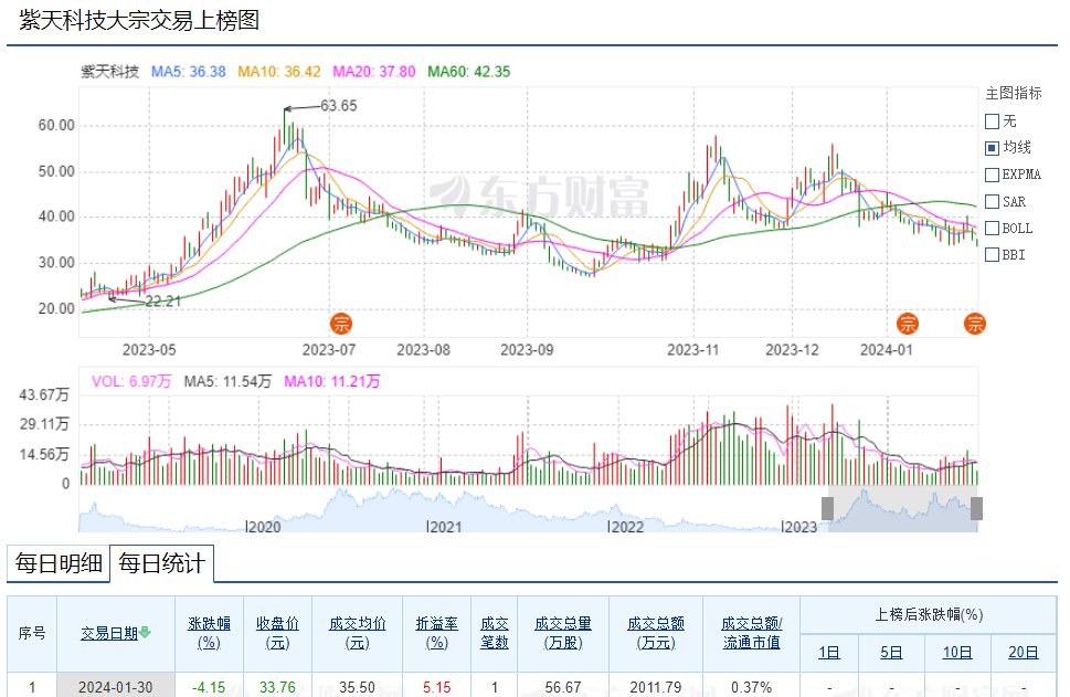 上证报中国证券网讯 据东方财富Choice数据,紫天科技(维权)昨日(1月30日)大宗交易成交56.67万股,成交均价35.5元,成交总额2011.79万元,相对当日收盘价溢价5.15%。