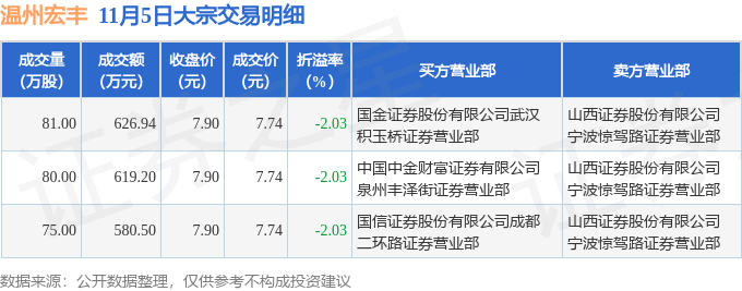 11月5日温州宏丰现1826.64万元大宗交易