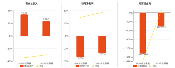 公司营业总收入为3.02亿元,在已披露的同业公司中排名第92,较去年同报告期营业总收入减少1.29亿元,同比较去年同期下降30.00%。归母净利润为-1.01亿元,在已披露的同业公司中排名第114。经营活动现金净流入为-1839.93万元。