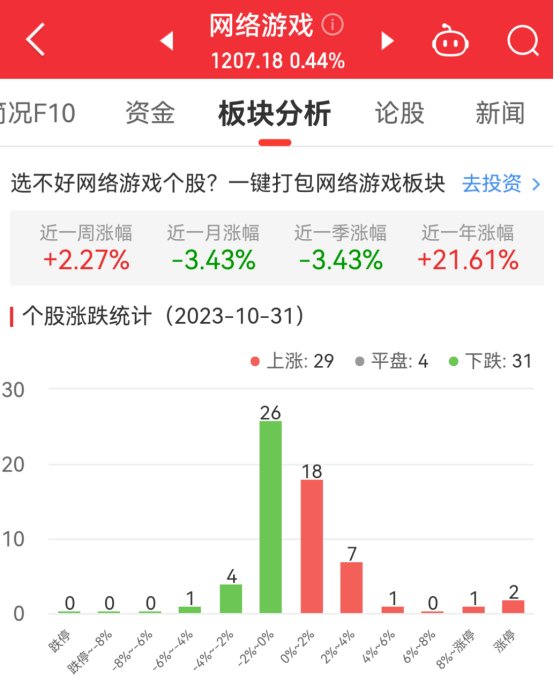 中国经济网北京10月31日讯今日,网络游戏板块整体涨幅0.44%,其中29只股票上涨,4只股票平盘,31只股票下跌。