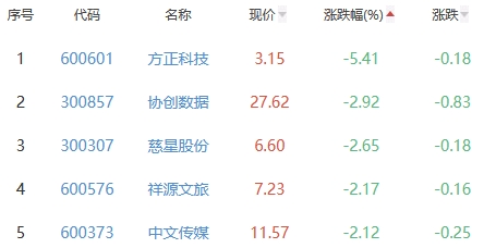 方正科技、协创数据、慈星股份(维权)、祥源文旅(维权)、中文传媒位列涨幅榜后五位,涨幅分别为-5.41%、-2.92%、-2.65%、-2.17%、-2.12%。