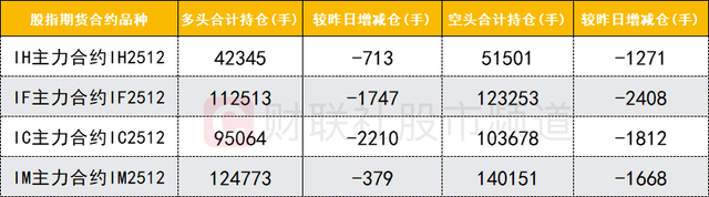 四大期指主力合约中,IH、IF、IC、IM合约多空双方均减仓,IM合约空头减仓数量较多。