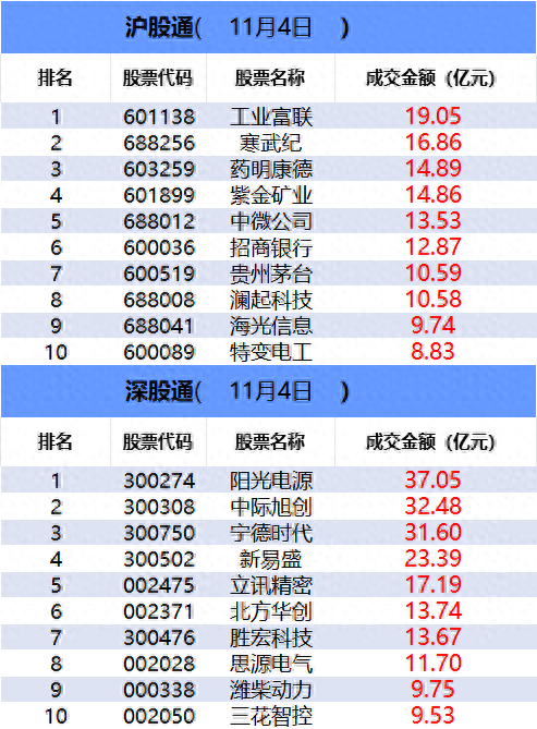 从沪股通前十大成交个股来看,工业富联位居首位;寒武纪和药明康德分居二、三位。
