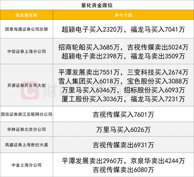 量化资金活跃度较高,万里马获量化席位(开源证券西安西大街、华林证券北京分公司)分别买入6346万、6026万。另一只“马字辈”股福龙马获两家量化席位买入1.4亿,同时遭一家量化席位卖出3509万。