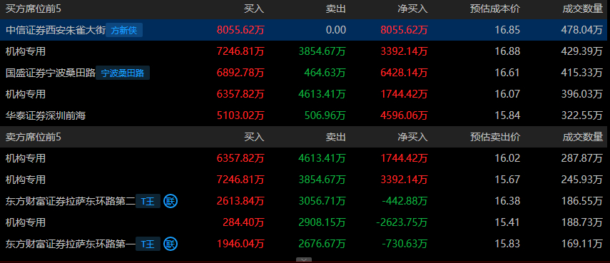 海峡创新(300300)今日涨16.39%,成交额34.03亿元,换手率32.59%,盘后龙虎榜数据显示,2家机构专用席位净买入5136.56万元,有1家机构专用席位净卖出2623.75万元。方新侠席位净买入8055万元,宁波桑田路席位净买入6428万元。