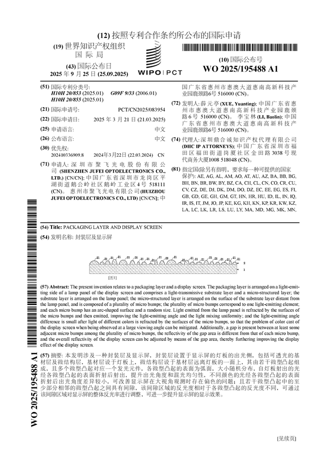 聚飞光电公布国际专利申请:“封装层及显示屏”