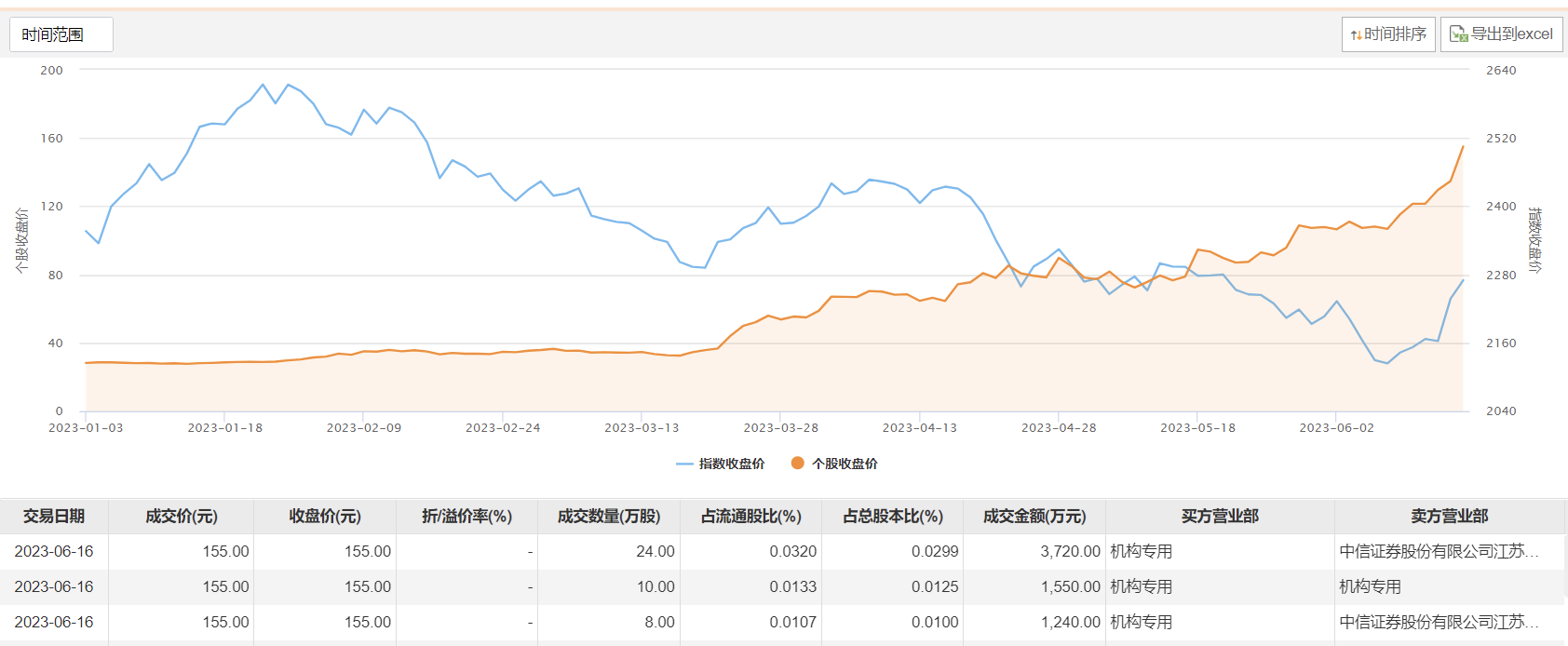 今日大宗交易成交42万股,成交额6510万元,占当日总成交额的0.97%,成交价155元,较市场收盘价持平。