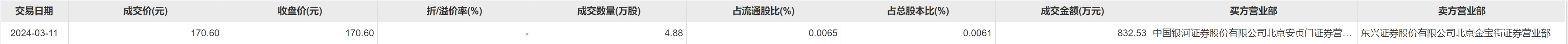 3月11日大宗交易成交4.88万股,成交额832.53万元,占当日总成交额的0.15%,成交价170.6元,较市场收盘价170.6元持平。