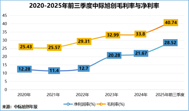 2025年前三季度,中际旭创毛利率达到40.74%,较年初增长近7个百分点;净利率达28.52%,较年初也增长近7个百分点。