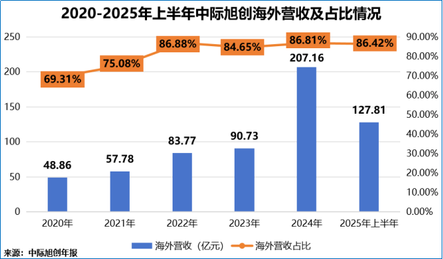 2025年上半年,公司海外业务贡献了127.81亿元的营收,占总营收的86.42%,凸显出海外市场在公司的绝对主导地位。