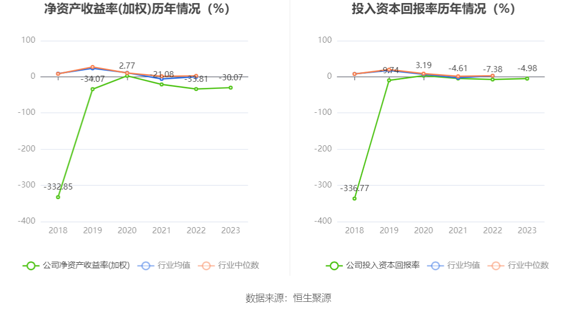 数据显示,2023年公司加权平均净资产收益率为-30.07%,较上年同期增长3.74个百分点;公司2023年投入资本回报率为-4.98%,较上年同期增长2.40个百分点。