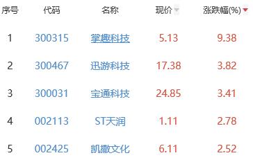 其中,掌趣科技、迅游科技、宝通科技、ST天润、凯撒文化位列板块涨幅前五位,涨幅分别为9.38%、3.82%、3.41%、2.78%、2.52%。
